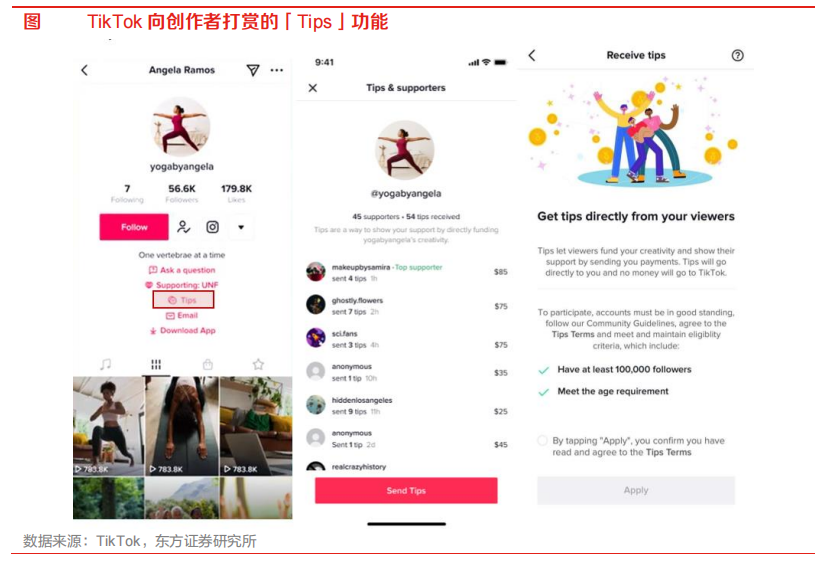 TikTok 向创作者打赏的「Tips」功能,图/东方证券