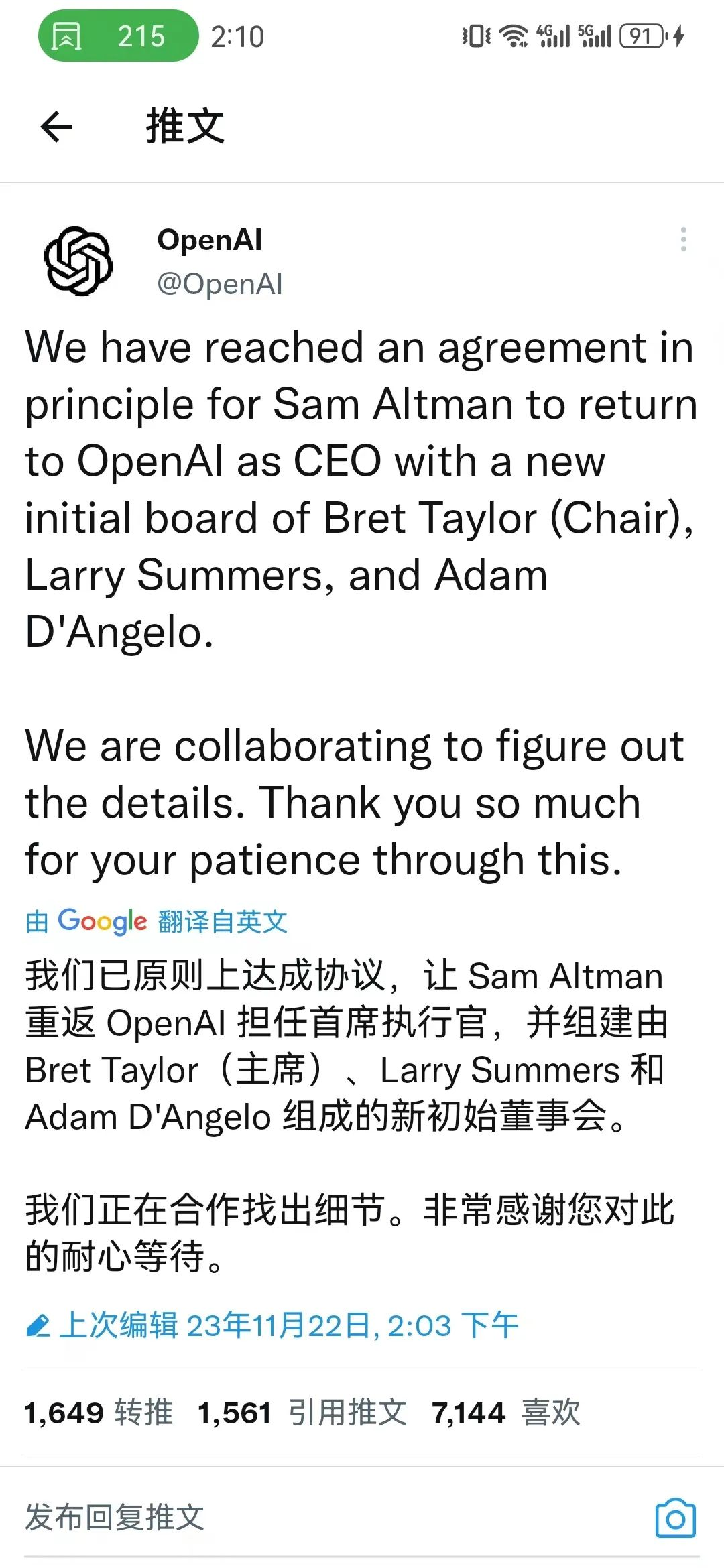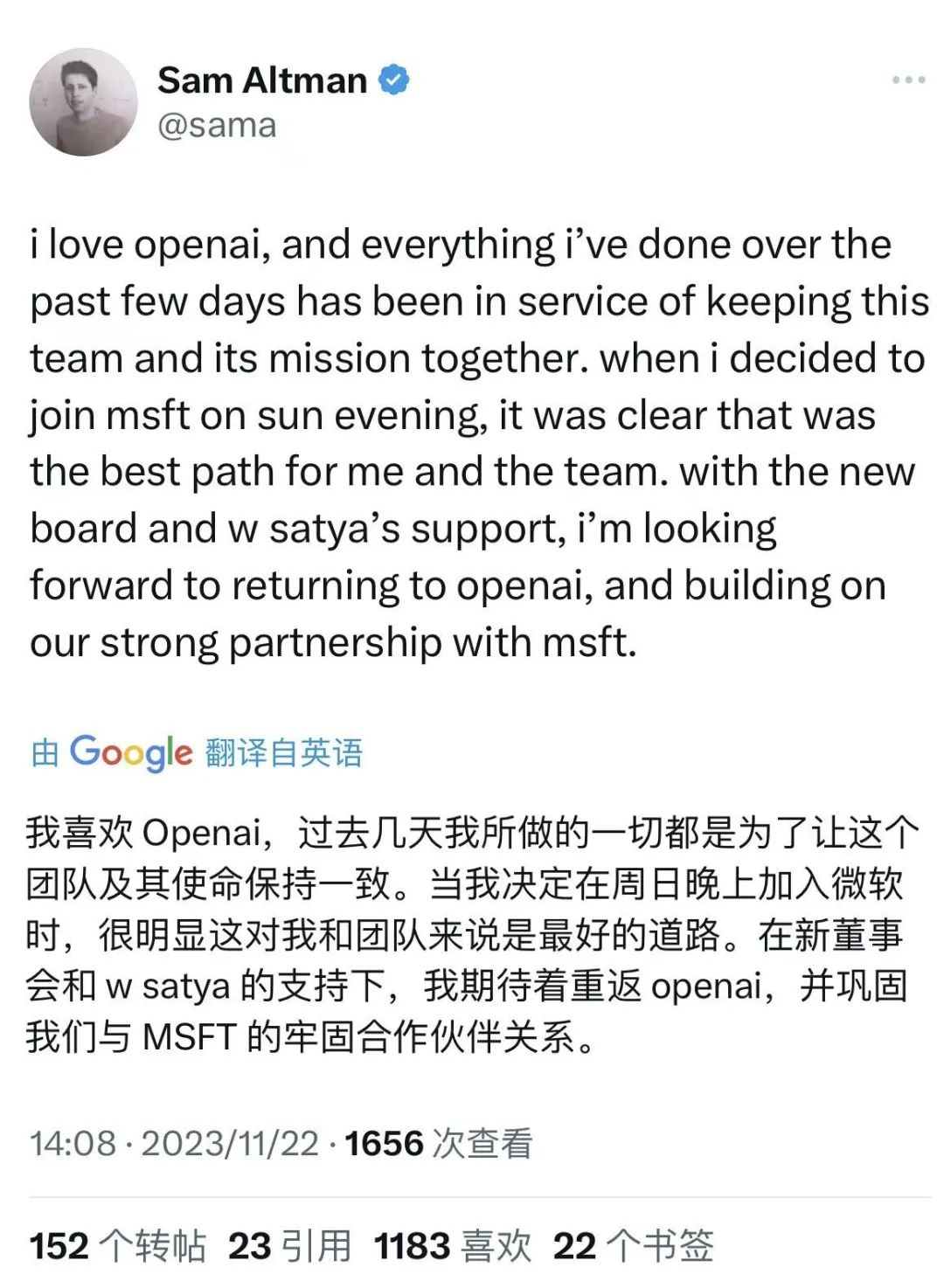 昨天下午,“OpenAI宫斗大戏”似乎已阶段性落幕。OpenAI表示,已就山姆·奥特曼恢复CEO职务原则上达成一致,山姆·奥特曼将回到OpenAI担任CEO。同一天,奥特曼表示,期待着重返OpenAI,并巩固与微软的牢固合作伙伴关系。