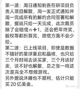 在脉脉社交平台上,“传字节朝夕光年大规模裁员”话题于11月26日登上热榜第一,也有网友贴出一张截图内容透露了,此次裁员的时间、赔偿方案和出售项目洽谈情况。