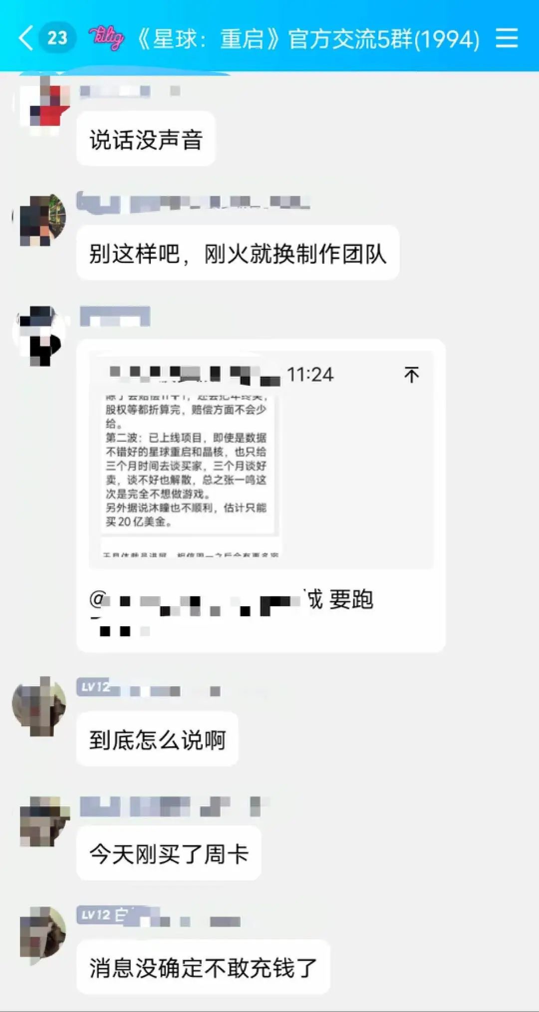 对于字节游戏的调整,游戏用户反应也比较强烈。在虚拟女团A-SOUL、《星球:重启》、《晶核》等官方群和贴吧内,不少用户都关切平台的后续发展,有用户表示不敢充钱了。