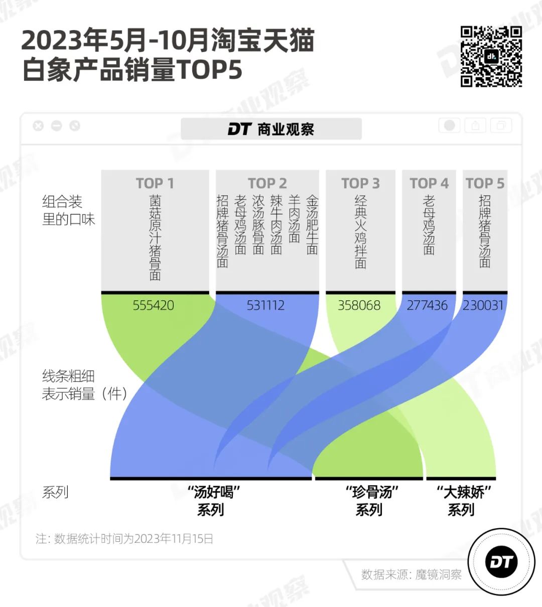这个系列的前身是白象2003年就推出的“1元大骨面”,主打大骨熬汤、营养健康,上市当年销量就破亿。