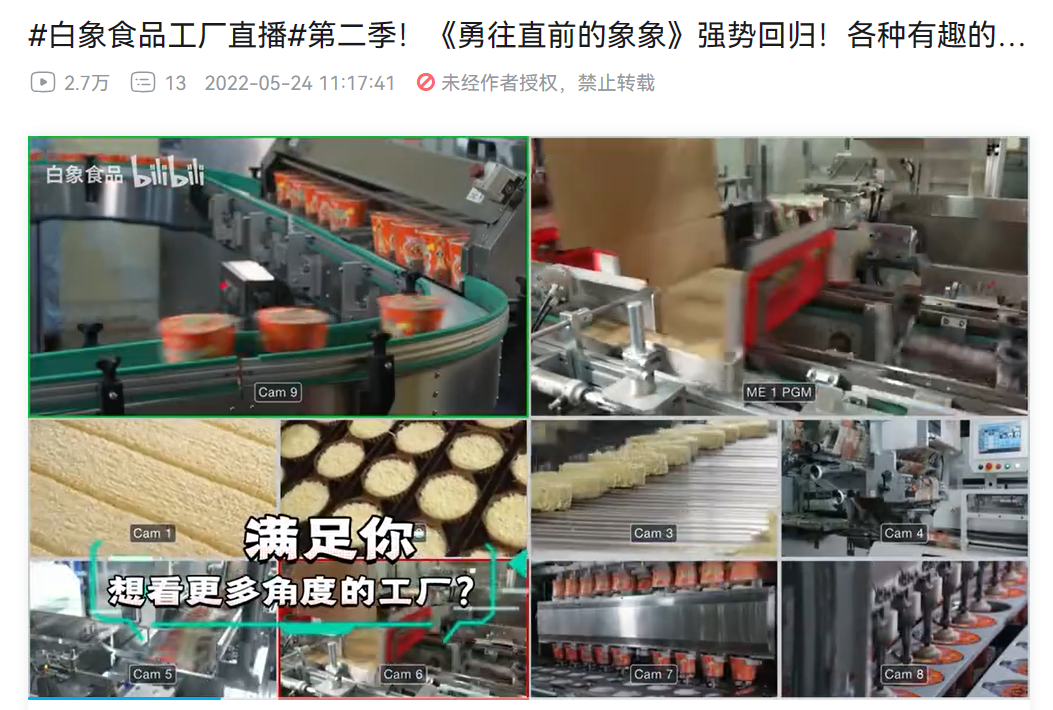 2021年年底,白象入驻B站,在B站开启了工厂“流水线”直播:
