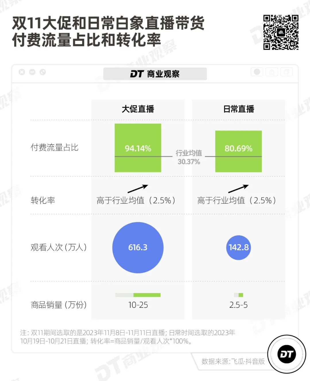 我们选取了白象在抖音的两场直播,发现无论是大促期间还是日常的店播,白象的流量来源主要靠投放,直播间的付费流量占比超过8成,远远高于行业均值30.37%。