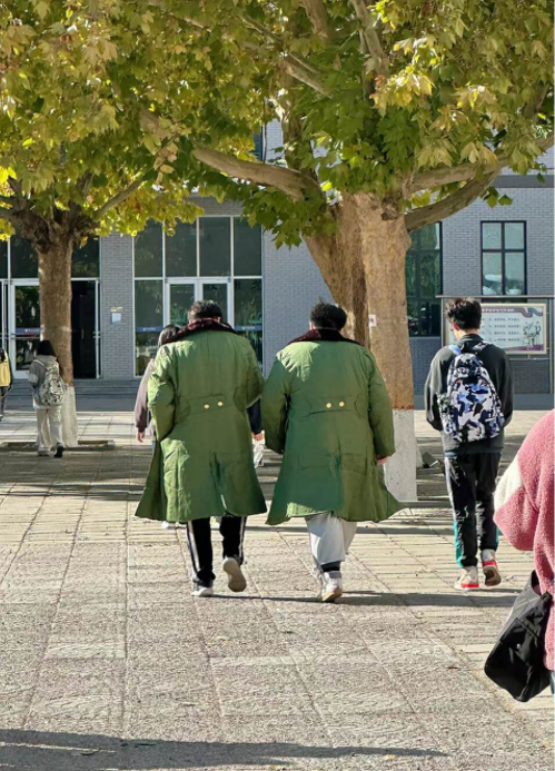某日中午,在河北上大学的小岛,在教学楼前看到两位穿着军大衣的同学出现在自己眼前,小岛下意识掏出手机拍了一张图,它说“没想到‘00后爱上军大衣’真不是短视频上的梗,身边真有这样的‘显眼包’。”