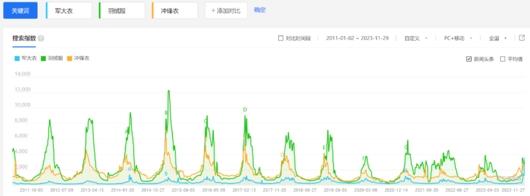 而更有意思的是,由于“羽绒服”“冲锋衣”和“军大衣”都具备明显的季节性,若将百度指数的对比时间段拉长至2011年可见,无论是“羽绒服”还是“冲锋衣”,在过去十余年时间,都是每个冬季的热度话题,唯有“军大衣”是在今年冬天才迎来自己的“巅峰”。