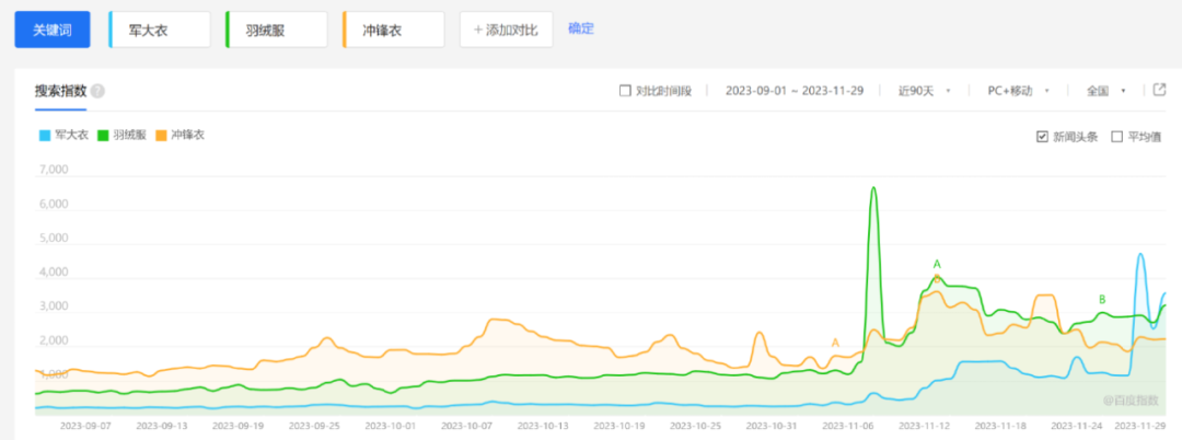 百度指数显示,“军大衣”的相关热度自11月中旬便有起势,在11月27日达到顶峰,指数翻3倍,热度一度盖过同时段的“羽绒服”和“冲锋衣”。