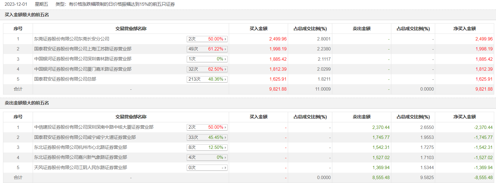 具体来看,知名游资现身龙虎榜,东莞证券东莞长安分公司、章盟主(国泰君安证券上海江苏路证券营业部)分别买入2499.96万元、1998.19万元;中信建投证券深圳深南中路中核大厦证券营业部、国泰君安证券咸宁咸宁大道证券营业部分别卖出2370.44万元、1745.77万元。