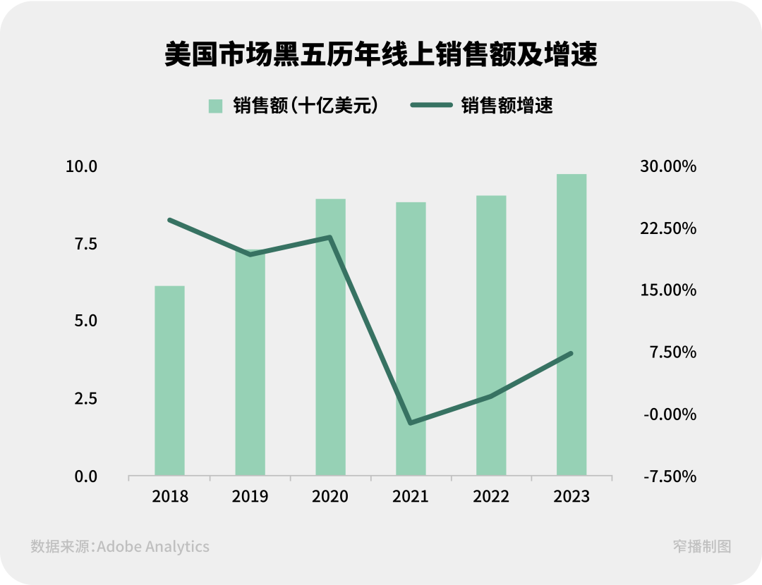 美国市场,全年最重要的大促节点之一黑色星期五也刚刚落幕。据电商研究机构Adobe Analytics的数据显示,今年黑五美国市场的线上消费总额同样超过预期,达到98亿美元的新高,较2022年同比增长7.5%,已经是后疫情时期的最高增速。
