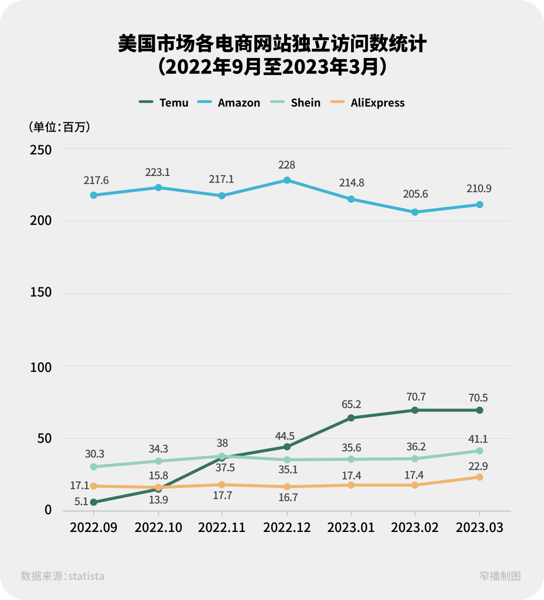 另一则来自SimilarWeb的数据显示,在美国市场的线上成交转化率方面,2023年9月,Temu转化率为4.6%,Shein为4.7%,Amazon则高居11.8%;到了大促预热的10月份,Temu转化率4.5%,Shein 4.1%,Amazon已经到了恐怖的56%。