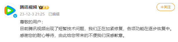 腾讯视频官方微博12月3日晚发文称,目前腾讯视频出现了短暂技术问题,正在加紧修复,各项功能在逐步恢复中。
