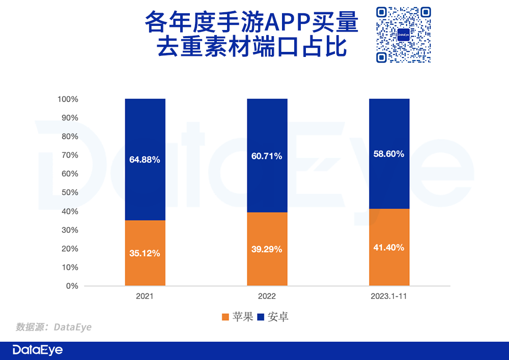 底气从何而来?其一,买量投放方面:游戏行业在降本增效态势下,更倾向于优先获取付费情况更高的用户来提ROI,而不是以更低成本去获取付费偏低的用户——这也是字节腾讯流量平台所引导的。一般而言,苹果的用户付费能力,普遍高于安卓。DataEye ADX数据显示:2021、2022、2023年1-11月,游戏APP(不含游戏平台、小游戏)投放于苹果端的买量素材(去重后)占比为35.12%、39.29%、41.40%,占比逐年提升。