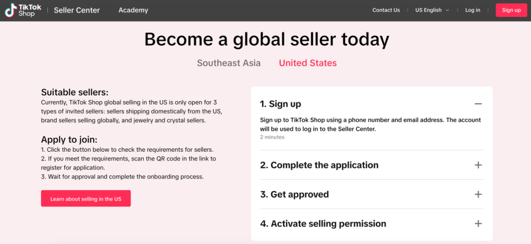 TikTok Shop招商网站,主推东南亚与美国地区,图源:TikTok Shop官网