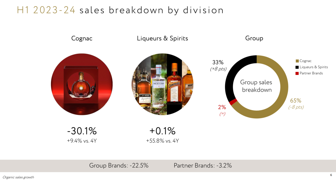 再来看下在销售额中占比33%的利口酒和其他烈酒(除干邑外的其他烈酒,包含白兰地、威士忌、朗姆酒等)。上半财年,该品类有机销售额同比上升0.1%,至2.06亿欧元(约合人民币15.92亿)。