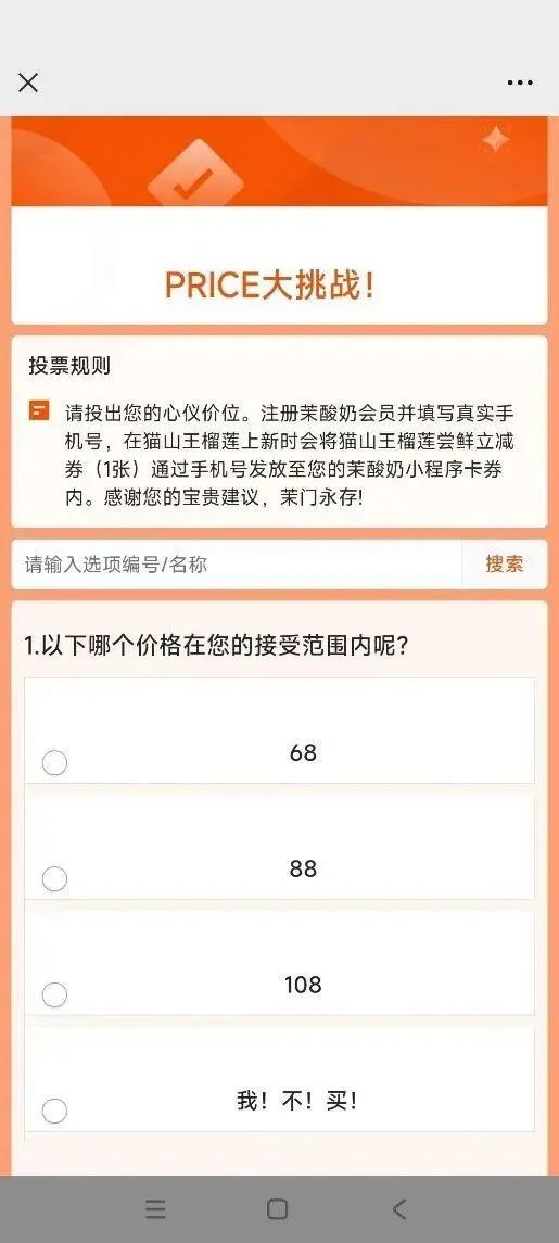 其次,2014年成立的茉酸奶一直不温不火,直到今年7月初因高价出圈。当时茉酸奶上线一份问卷调查,就新品“猫山王榴莲”系列向消费者征集价格,共有三档价位,分别为68元、88元和108元。此举瞬间引来了“酸奶刺客”“贵得离谱”等评论,同时,关于“茉酸奶到底是不是酸奶”的讨论也很激烈。