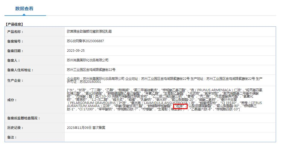 根据国家药监局国产普通化妆品备案平台信息显示,滋润版小蜜罐产品备案名称为欧莱雅金致臻颜花蜜胶原面霜,轻盈版小蜜罐产品备案名称为欧莱雅金致臻颜花蜜胶原轻乳霜。这两个产品均由苏州尚美国际化妆品有限公司(欧莱雅旗下子公司)进行备案与生产,备案时间均为9月25日。根据备案信息显示,两款产品中均含有“胶原”这一成分,即是指重组胶原蛋白。