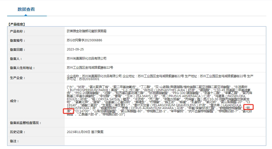 事实上,这已不是欧莱雅集团首次使用中国成分。据了解,就在今年8月,欧莱雅集团旗下另一品牌羽西也在多款产品中添加了001号化妆品新原料——由武汉中科光谷绿色生物技术有限公司(下称中科光谷)备案生产N-乙酰神经氨酸(又称燕窝酸)。