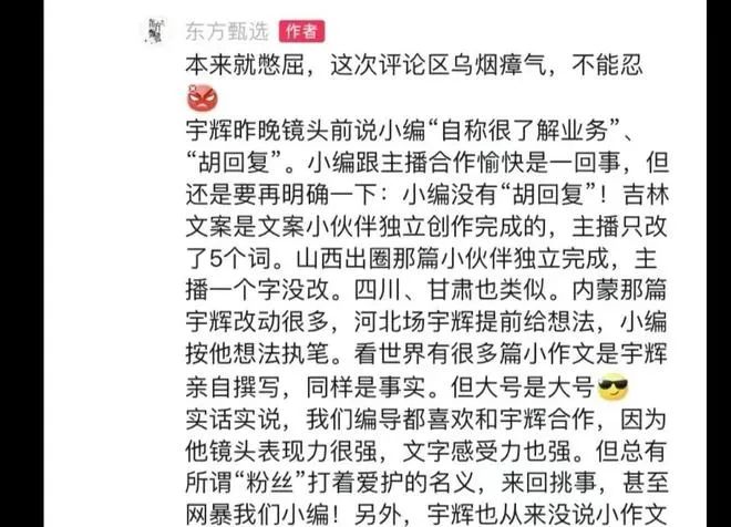 沸沸扬扬的“小作文”事件,也是始于东方甄选小编在置顶“每一次小作文制作都是出自团队”后,众多感到愤怒的董宇辉粉丝认为,小编是在否认董宇辉贡献,开始围攻小编,才引发一系列风波。