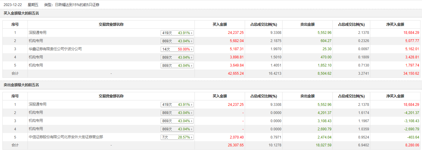 掌趣科技12月22日跌16.09%,全天换手率达18.84%,振幅达18.24%。龙虎榜数据显示,营业部席位合计净买入2.37亿元。其中,机构买入1.32亿元,卖出1.29亿元,合计净买入303.74万元。此外,深股通专用、中信证券北京安外大街证券营业部分别卖出5552.96万元、2474.04万元;深股通专用、华鑫证券宁波分公司分别买入2.42亿元、5187.31万元。