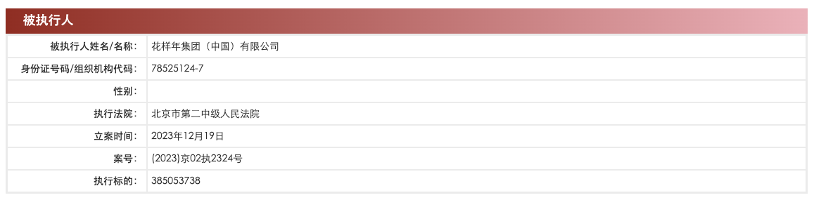 中国执行信息公开网显示,12月19日,花样年集团(中国)有限公司、青岛美域星海置业有限公司、成都市花样年房地产开发有限公司、桂林市临桂区万福宝商业有限公司新增一则被执行人信息,执行标的3.85亿余元,执行法院为北京市第二中级人民法院。