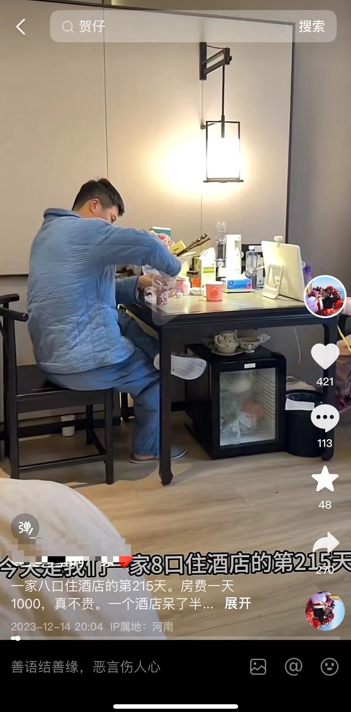 视频最开始发布在抖音上,博主称自己一家8口人已经在河南省南阳市镇平县里的一家酒店住了半年,觉得很划算,准备一辈子住在酒店。