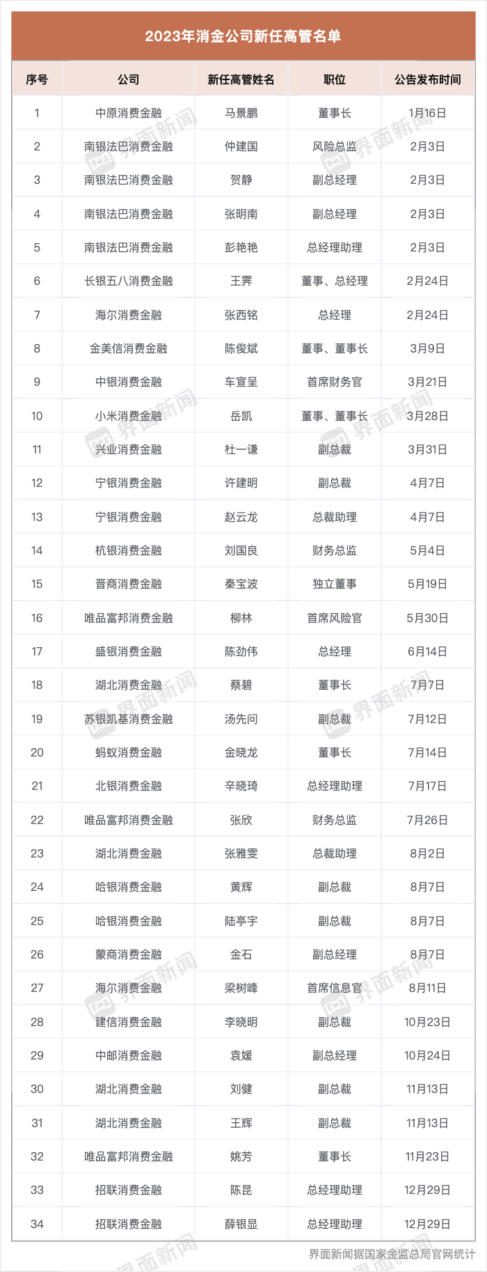 2023年,消费金融行业高层更迭频繁,共有34位高层履新,其中不乏董事长、总经理等关键岗位。