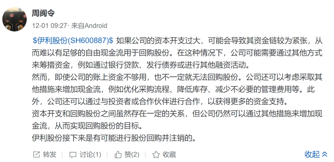 雪球用户“小谢价值投资”就认为,伊利应该再拿出5亿到15亿回购注销自己的股份。“最近A股大量企业回购注销,就连房地产企业也照样回购注销。结合伊利业绩非常优秀,估值也非常低,未来成长性也非常好。现在国内不断降息贷款利率也非常低,伊利的资金相对来说还是非常宽裕的。市值对公司的重要性不言而喻。”“周阆令”也表示,“即使资本开支过大,也可以通过其他措施增加现金流,从而回购股份。伊利接下来是有可能进行股份回购并注销的。”