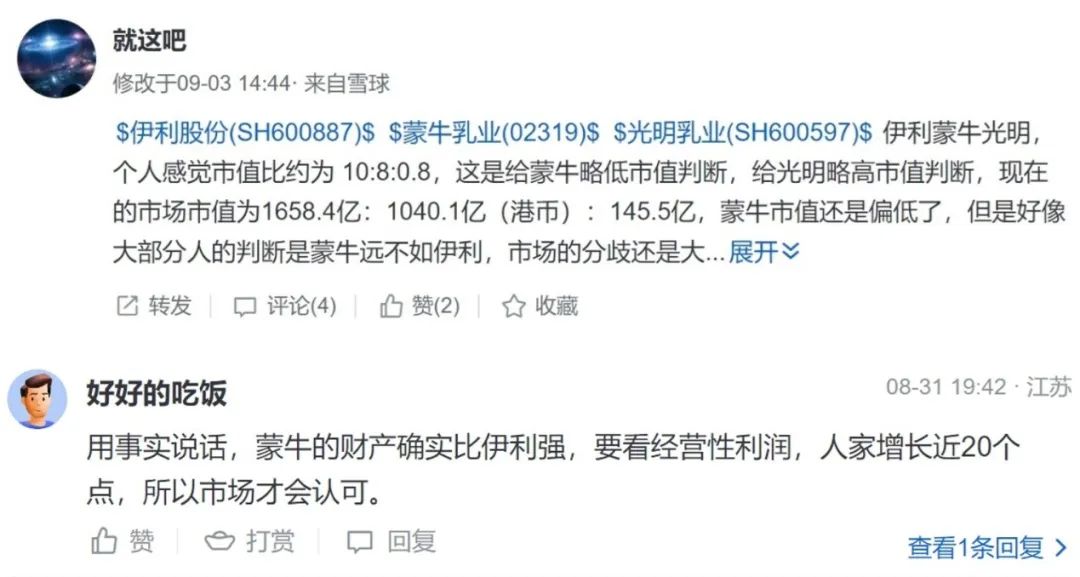 而蒙牛由于采用的是“细水长流”的回购方式,并未引发市场的广泛关注。只是有投资者在谈及蒙牛、伊利的估值对比时,为蒙牛打抱不平,称“蒙牛现在的市值偏低”“蒙牛的财产确实比伊利强,所以市场才会认可”。