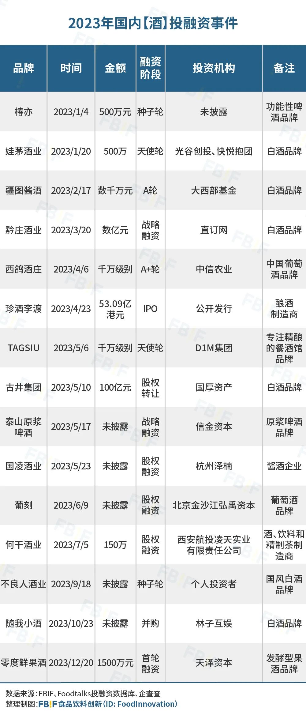 2023年,酒类赛道共发生了15起融资事件。该数据与去年的41起相比,有明显下滑。而在融资金额方面,仅2起亿元级别融资事件,分别为珍酒李渡上市募资53亿港元、黔庄酒业拿到了直订网数亿元战略投资。