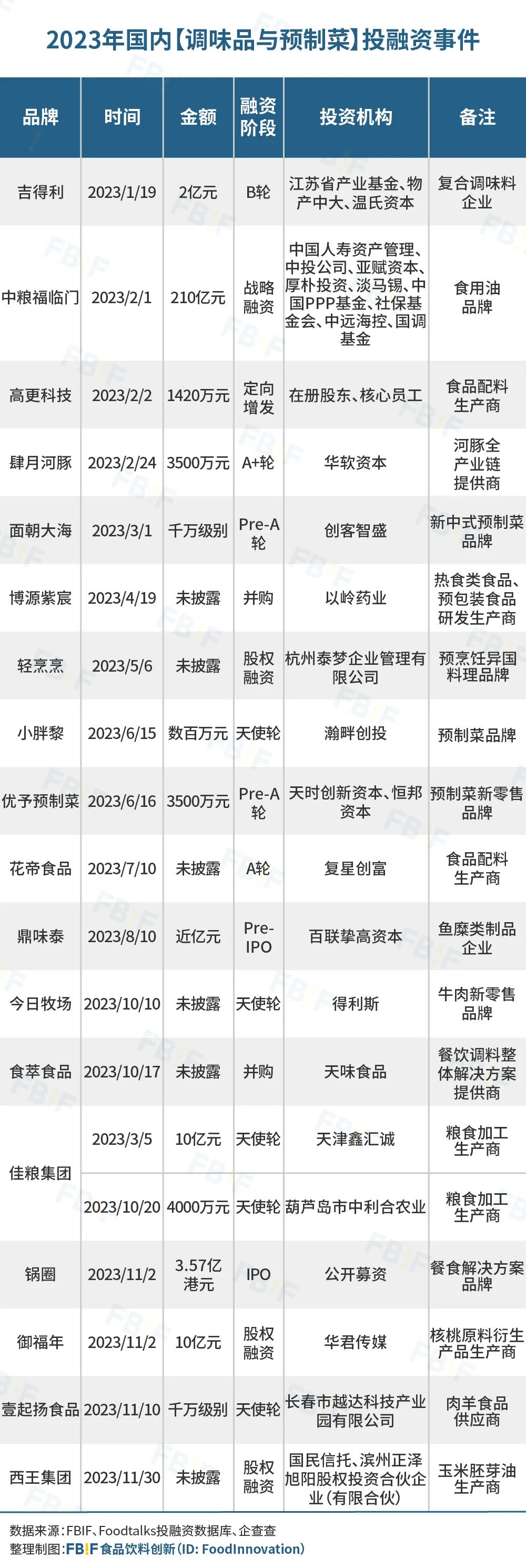 2023年,调味品与预制菜品类上共发生了19起融资事件,与去年21起相比略有回落。在19起融资事件中,预制菜品类融资有10起,调味品品类融资9起。