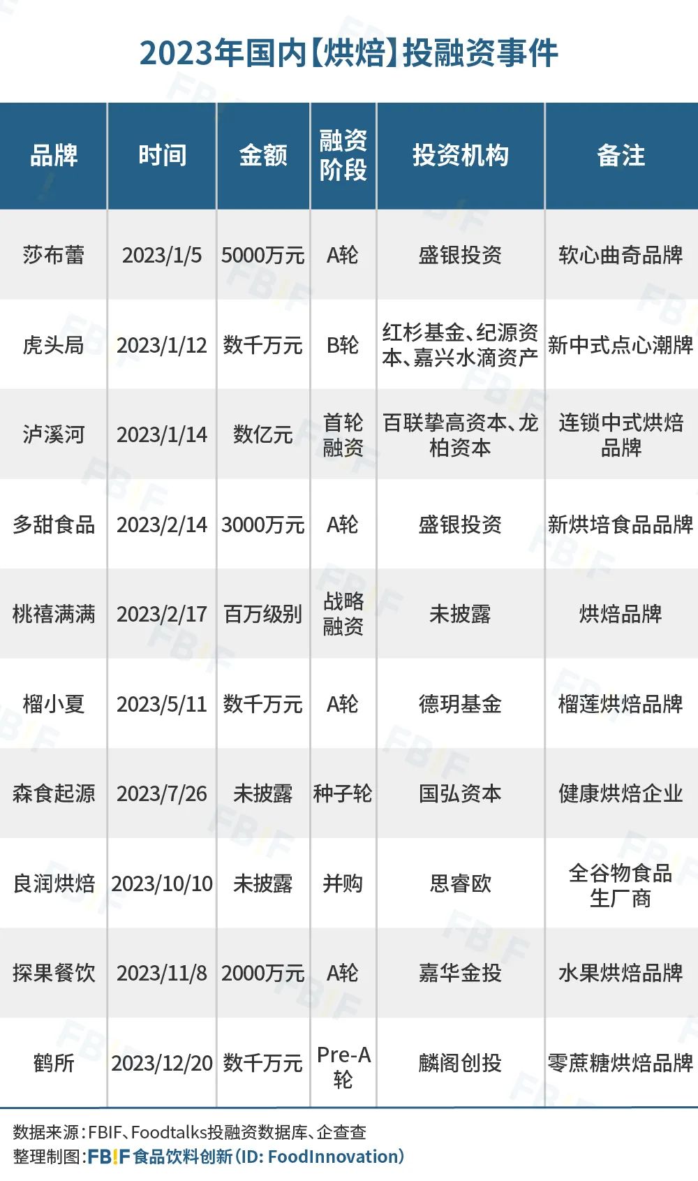 2023年,烘焙行业共发生10起投融资事件,去年该数字为15起。从融资轮次上来看,10起投融资事件多集中在A轮和B轮上,如鹤所、探果餐饮、榴小下、多甜食品和莎布蕾拿到了A轮阶段融资。今年1月,新中式点心潮牌虎头局拿到了红杉基金、纪源资本、嘉兴水滴资本数千万元的B轮融资。