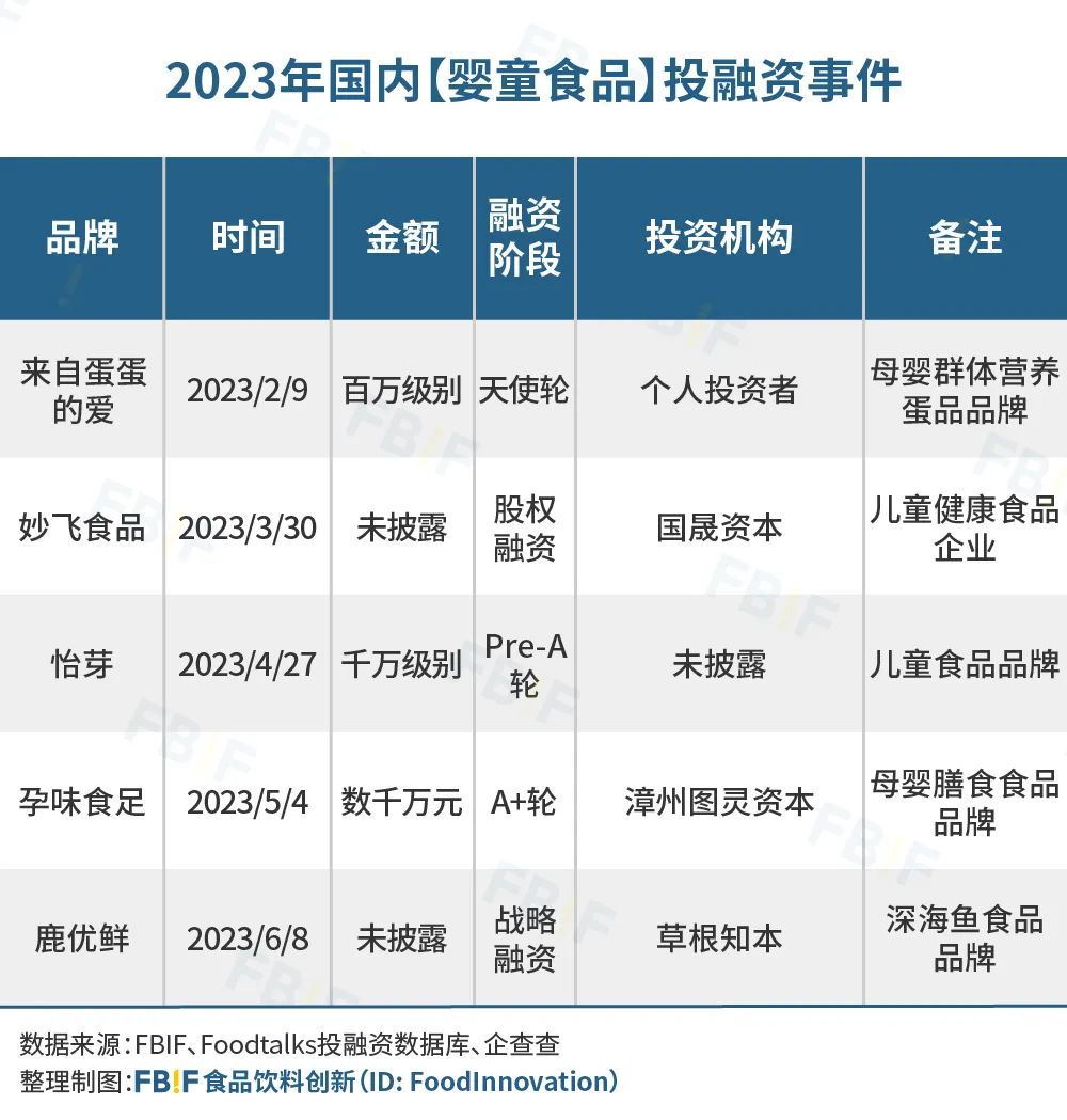 2023年,“婴童食品”品类共发生5起投融资事件。其中,有三家企业处于早期融资阶段,分别是母婴膳食食品品牌“孕味食足”完成A+轮融资,母婴群体营养蛋品品牌“来自蛋蛋的爱”完成天使轮融资,儿童食品品牌“怡芽”完成Pre-A轮融资。去年,“怡芽”也拿到了一轮融资。