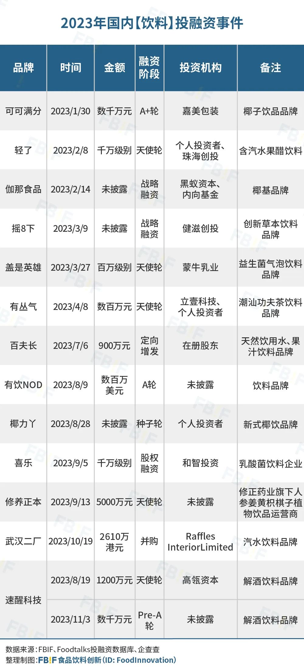 2023年,国内饮料赛道共发生14起投融资事件,与去年持平。在已披露的数据中,最大额为修正药业旗下人参姜黄枳棋子植物饮料品牌“修养正本“获得5000万元天使轮融资。另外,武汉二厂以并购的形式“曲线上市”也颇受关注。