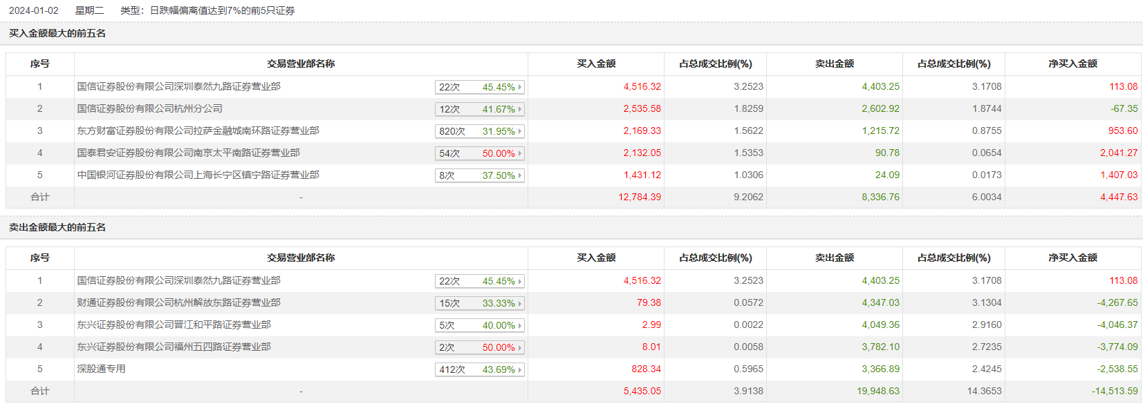 1月2日,天威视讯今日跌9.92%,龙虎榜数据显示,上榜营业部席位全天成交3.76亿元,占当日总成交金额比例为27.07%。其中,买入金额为1.37亿元,卖出金额为2.39亿元,合计净卖出1.02亿元。