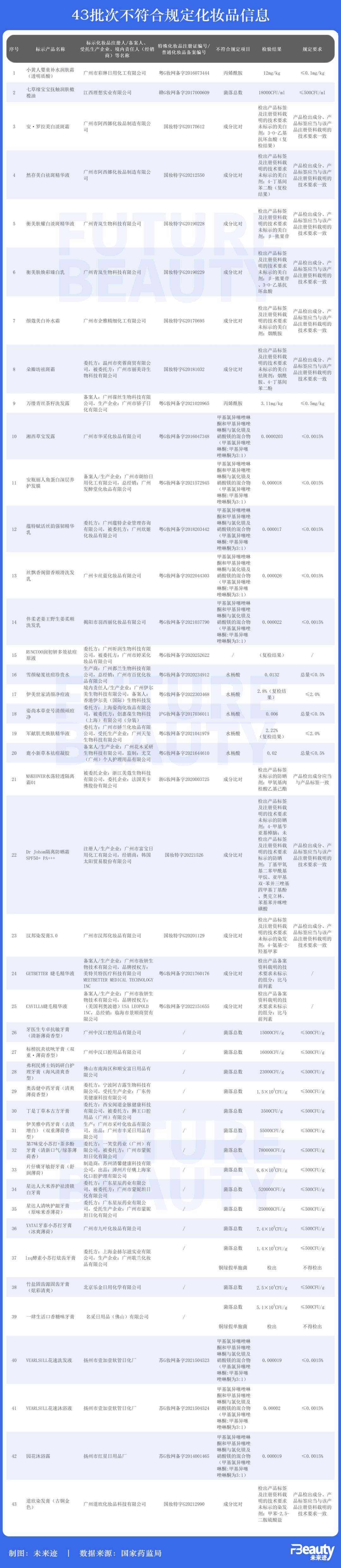 1月4日,国家药监局发布“关于43批次不符合规定化妆品的通告”。该公告涉及婴童、牙膏、洗护、防晒、祛痘、美白等多个品类多个品牌,“行业顽疾”依然难除。
