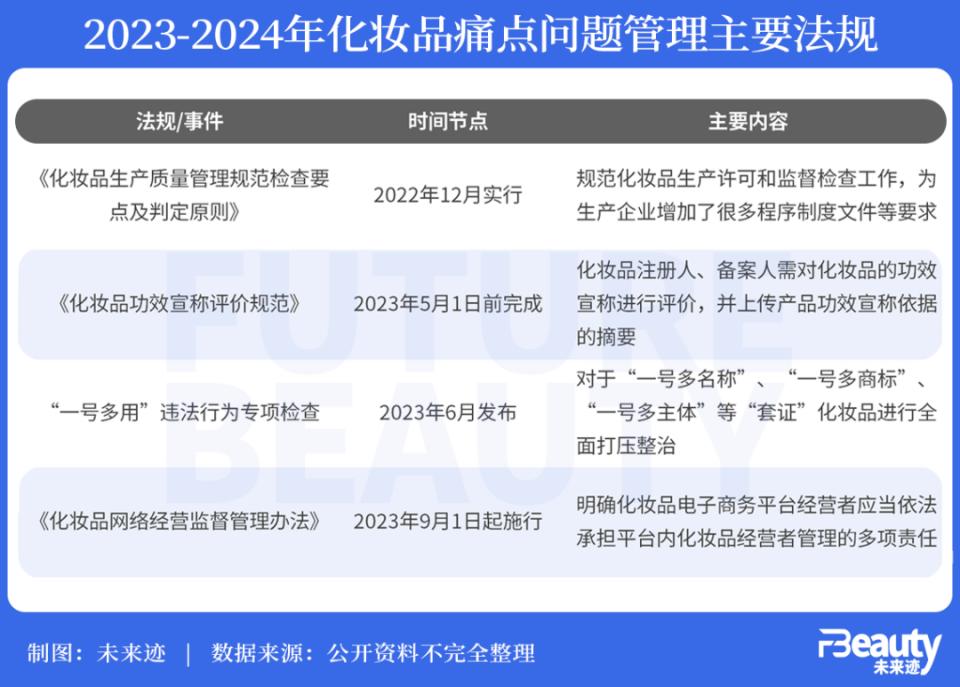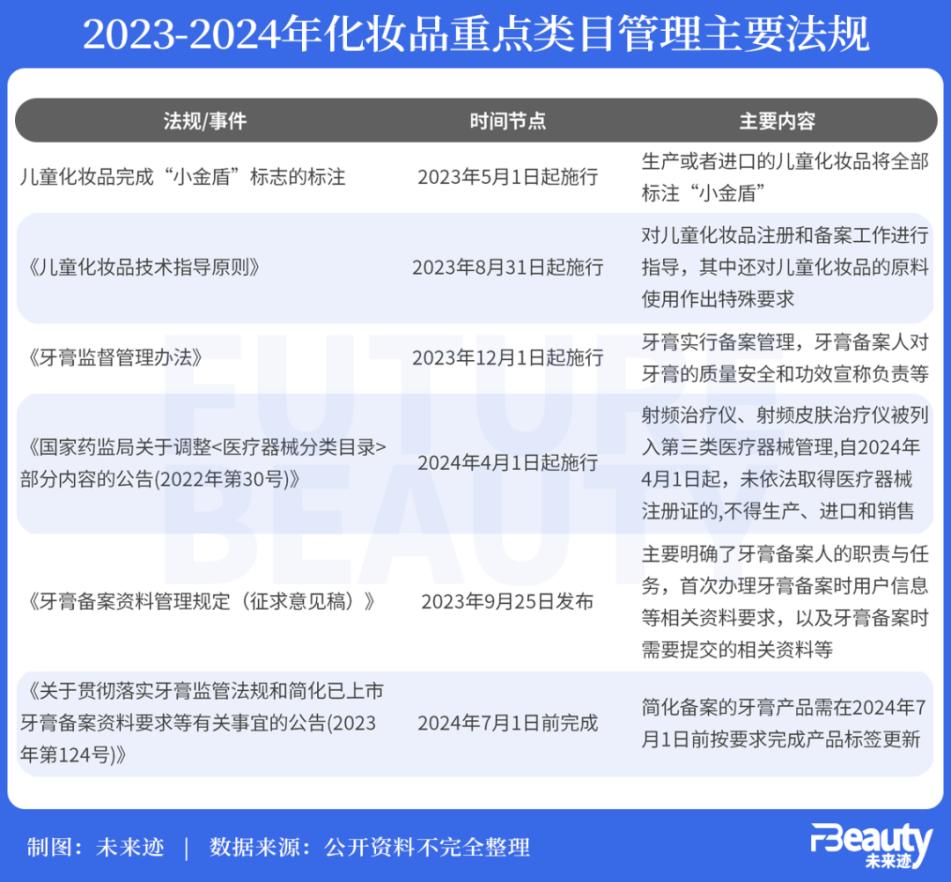 过去两年,国家发布或正式实施了多款化妆品相关法律法规。包括“一号多用”、功效宣称等痛点领域。此外,专门面向电商平台的《化妆品网络经营监督管理方法》也于2023年9月1日开始实行。在细分品类上,儿童化妆品、美容仪、牙膏也相继迎来监管细则,多项重要法规将于2024年正式执行。