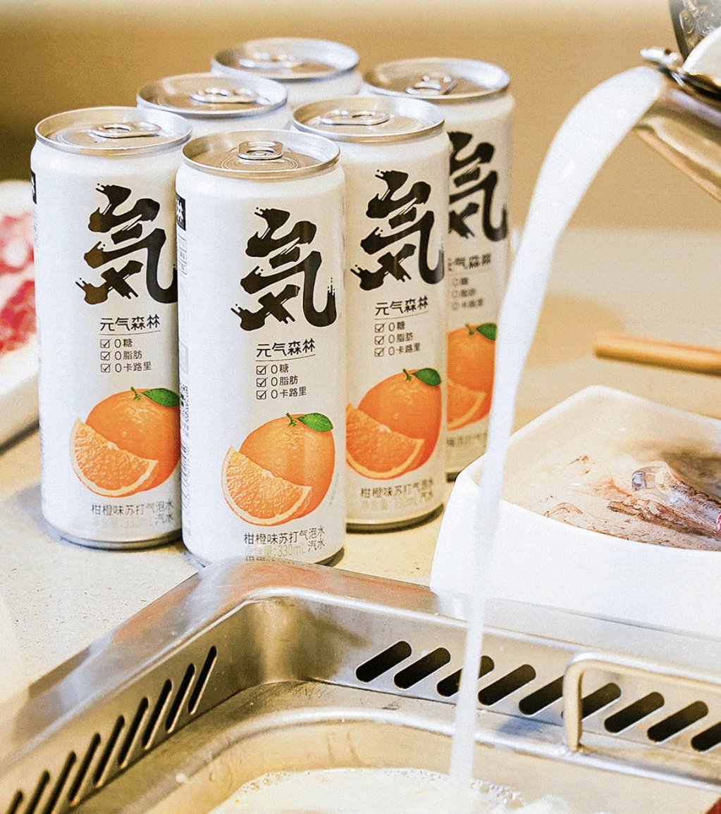 这次的联名产品则是元气森林针对餐饮渠道推出的330ml易拉罐装的白桃味气泡水,并使用了定制的龙年红色包装。从整个消费场景上看,重点在强调“火锅配气泡水”“要爽不要糖”这样的卖点。