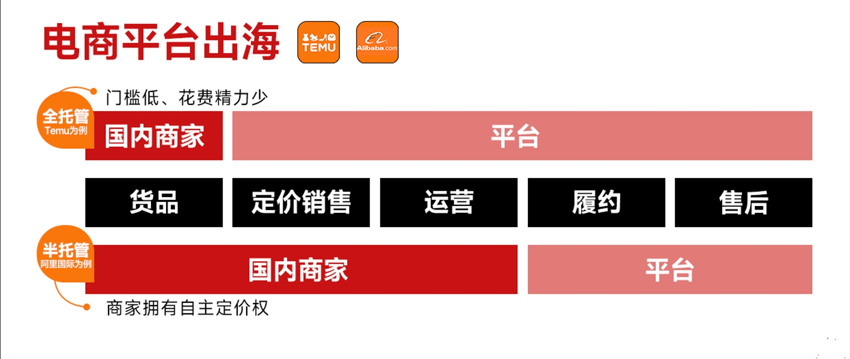 2022年9月Temu上线之初,便向拼多多商家提供“一键出海”+全托管服务,吸引到大量此前没有跨境经验的国内商家。全托管模式下,商家只需要开店和发货,承担平台退货带来的库存和物流成本,运营、物流、履约及售后环节一律由平台负责,不再需要商家承担费用,从而使国内商家涉足海外市场的门槛大幅降低。
