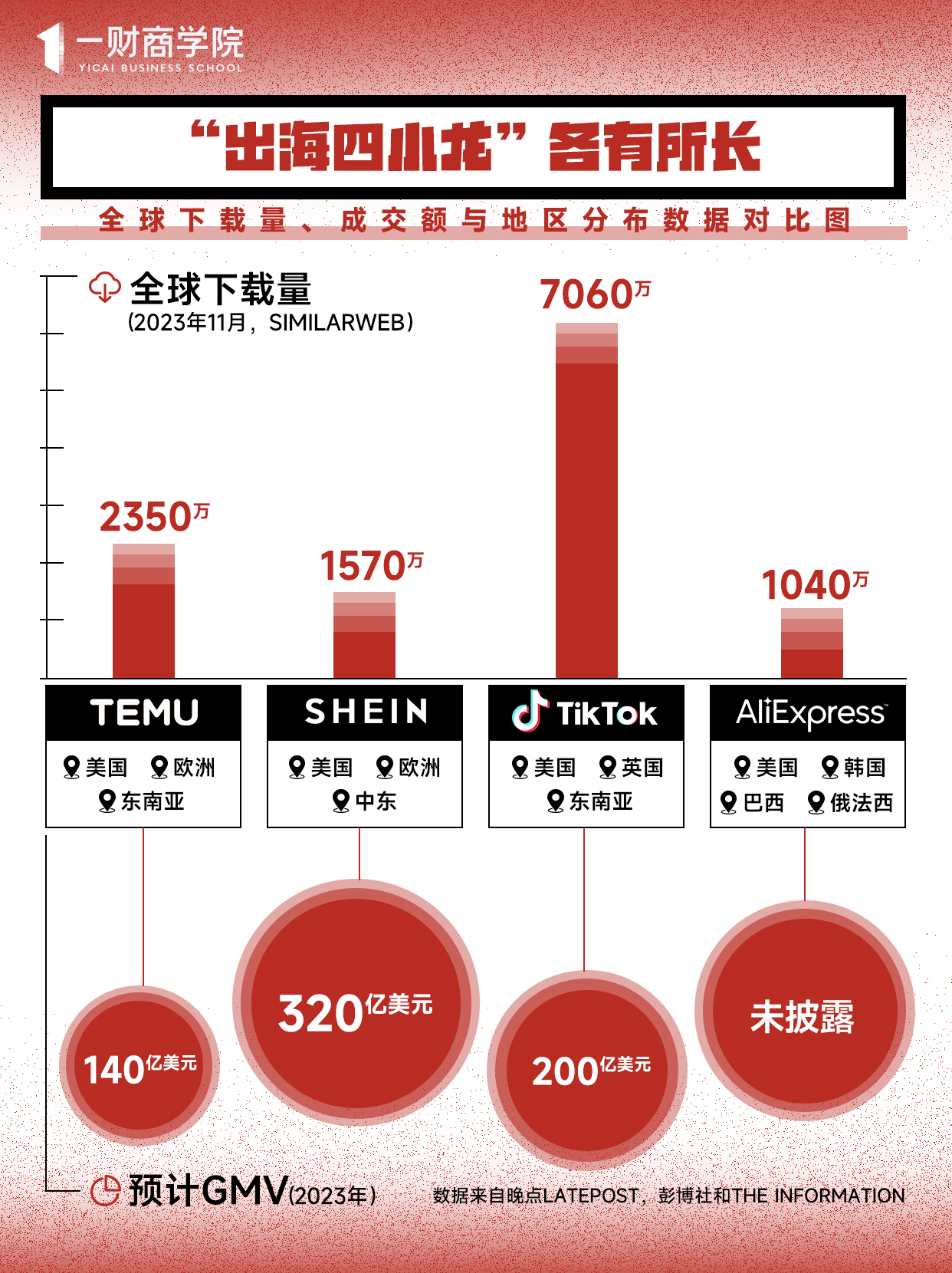 靠着比Zara还快的上线速度,Shein的市场份额也很快赶超Zara。Coresight数据显示,Shein在2022年占全球快时尚市场近五分之一的份额,超过Zara(占11%)和H&M(占20%)。2020年营收达到近100亿美元,连续8年增速超过100%。2023年Shein的GMV预计将达到320亿美元,规模位居“出海四小龙”(速卖通、Shein、Temu和TikTok Shop)之首。