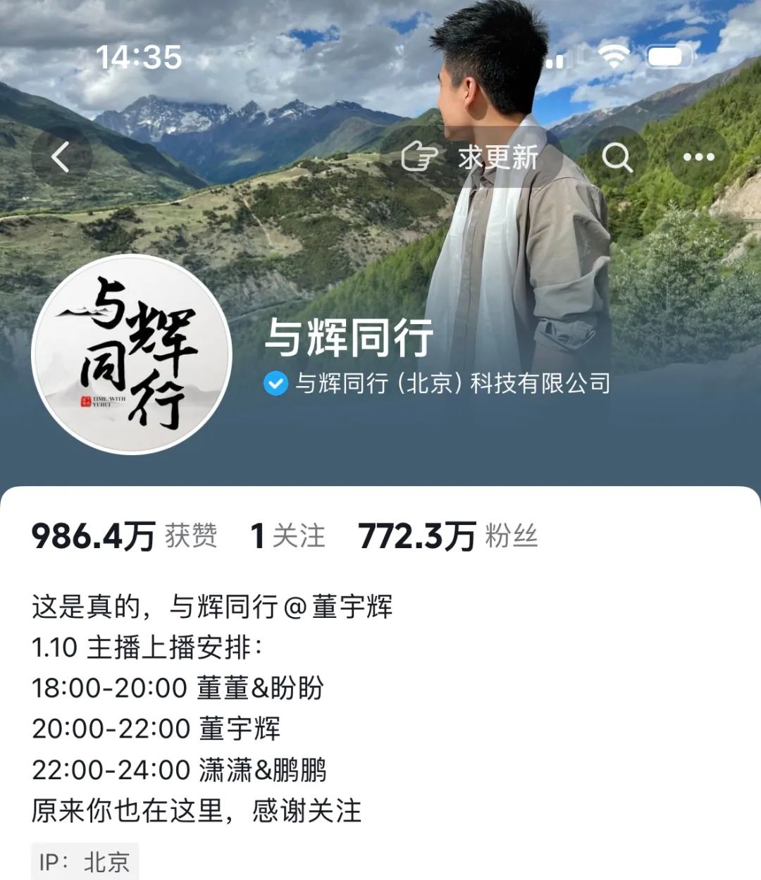 公开资料显示,昨日新开播的@与辉同行,是与辉同行(北京)科技有限公司旗下账号,该公司以董宇辉个人工作室的形式存在,企业注册资本为1000万元,董宇辉任公司法定代表人、执行董事、经理,俞敏洪担任监事。