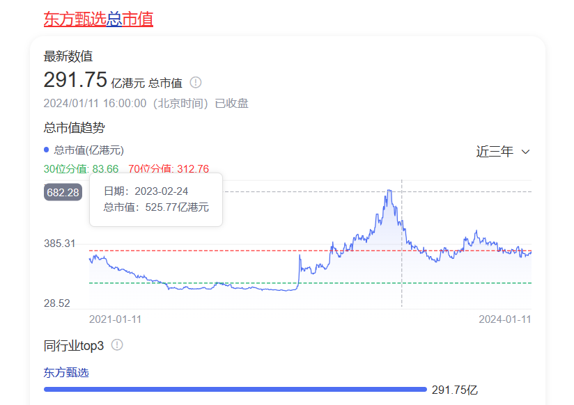 当初“小作文”事件骂声最盛时,东方甄选一日市值蒸发40亿港元,总市值276.08亿港元。但截至发稿,东方甄选市值回到了291.75亿港元,股价涨幅一度高达15.43%,不少专业人士表示其市值有望重回300亿港元大关。
