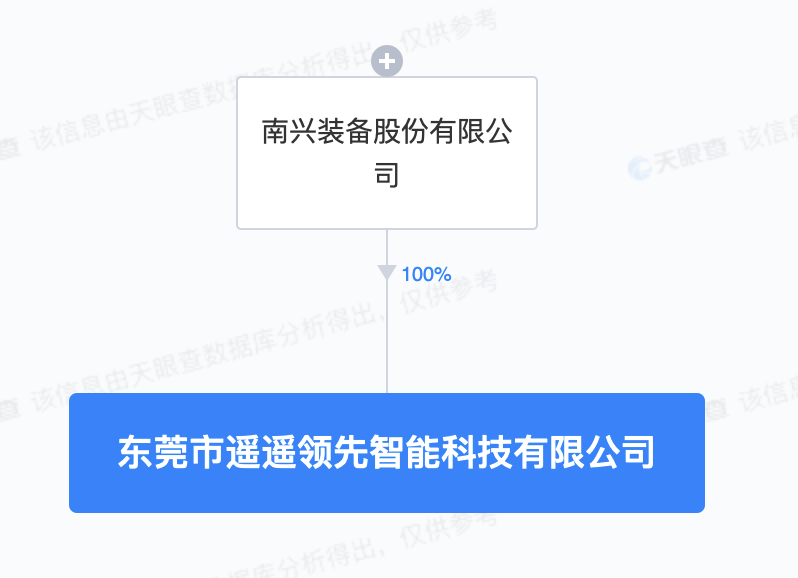 天眼查APP显示,东莞市遥遥领先智能科技有限公司成立,注册资本5000万元,经营范围包含:工业机器人制造;人工智能应用软件开发;以自有资金从事投资活动等。天眼查股权穿透显示,该公司由南兴股份100%控股。
