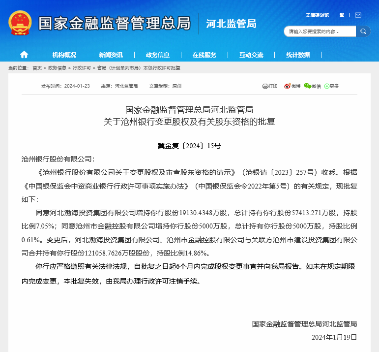 1月23日,国家金融监督管理总局官网披露,同意沧州市金融控股有限公司等增持沧州银行股份,交易后,沧州市金融控股有限公司等关联方持股比例14.86%。