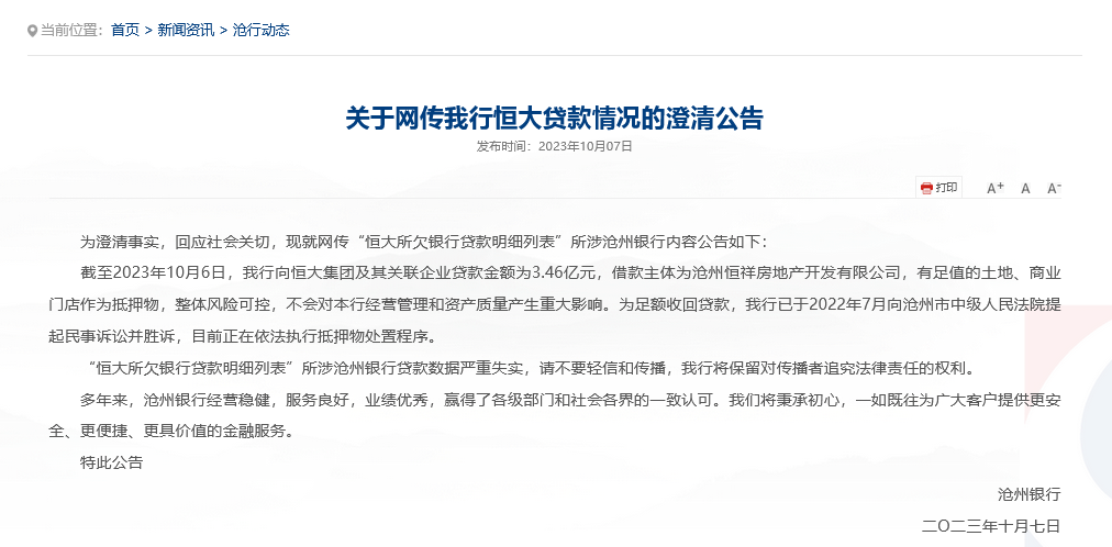 地方三大金融部门联名为沧州银行辟谣,事关国庆假期网络流传“沧州银行在恒大集团有大量不良贷款”的信息有关。此后沧州银行在官网正式回应,称“恒大所欠银行贷款明细列表”所涉沧州银行贷款数据严重失实。