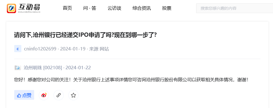1月22日,有投资者在网上向沧州明珠询问,沧州银行何时上市,具体进展到哪一步。对此,沧州明珠董秘回复称,“感谢您对公司的关注!关于沧州银行上述事项详情您可咨询沧州银行股份有限公司以获取相关具体情况”。