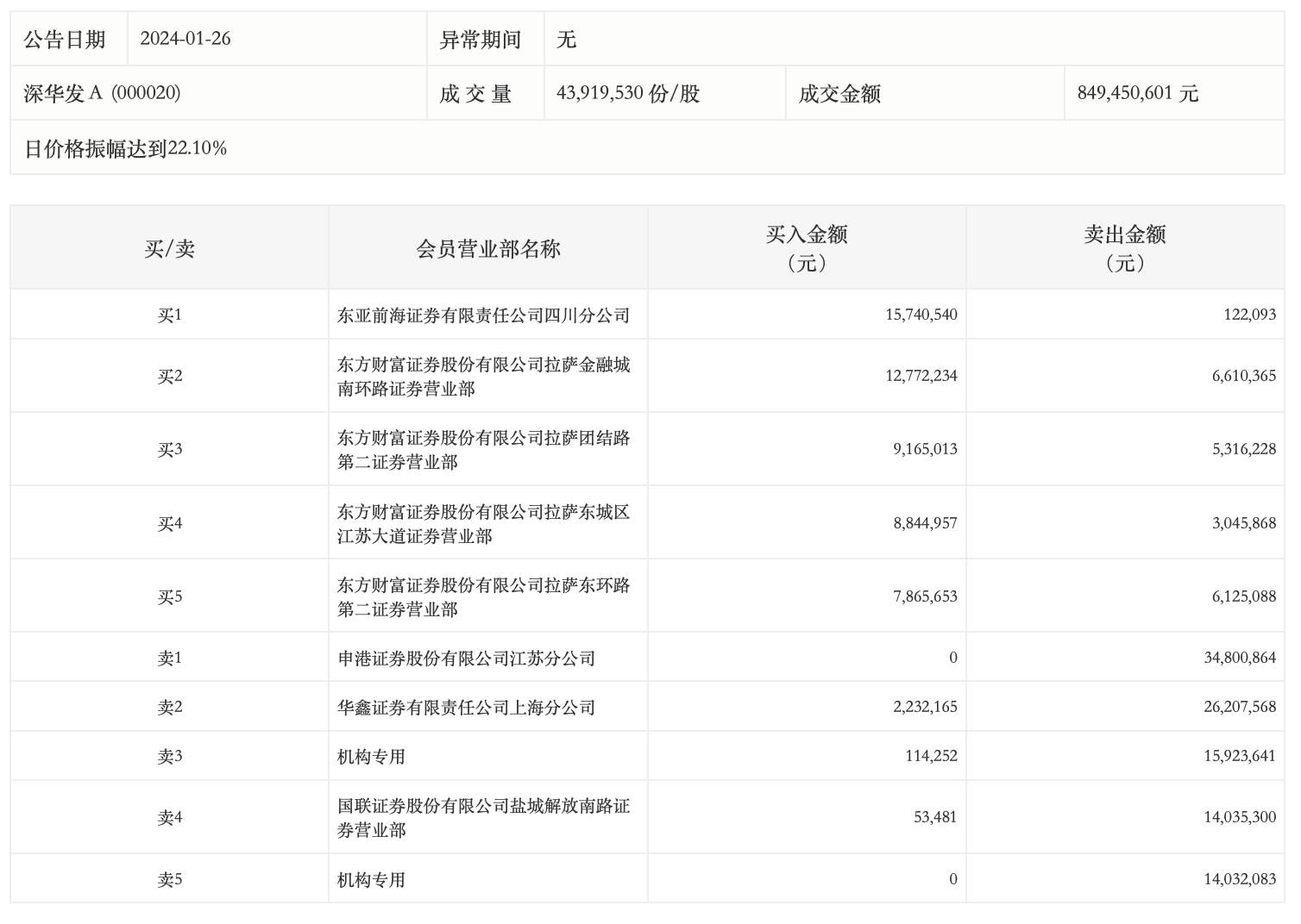 1月26日,深华发A今日涨停,全天换手率达24.24%,振幅达19.91%。龙虎榜数据显示,营业部席位合计净卖出6943.08万元。其中,机构买入11.43万元,卖出2995.57万元,合计净卖出2984.15万元。此外,东亚前海证券四川分公司、东方财富证券拉萨金融城南环路证券营业部分别买入1574.05万元、1277.22万元;申港证券江苏分公司、华鑫证券上海分公司分别卖出3480.09万元、2620.76万元。