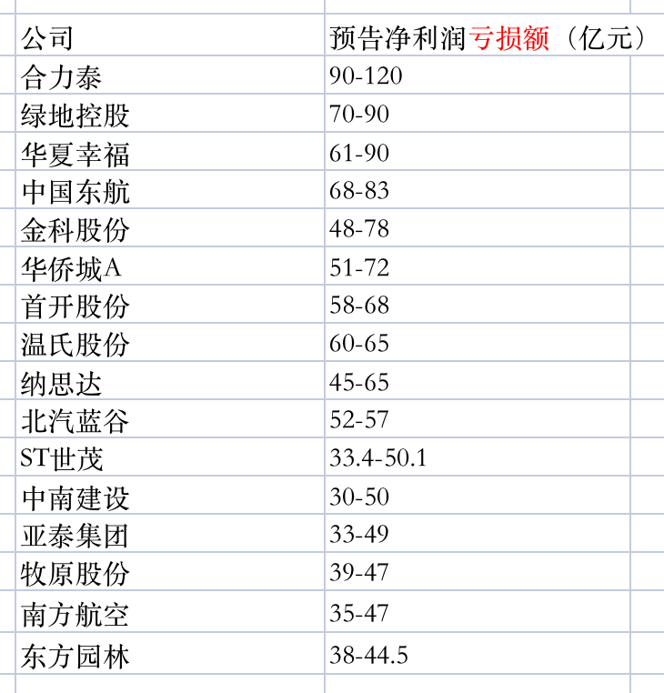 同样有亏损夸张的,还有来自地产板块的绿地控股(600606.SH)、华夏幸福(600340.SH)、金科股份(000656.SZ)、华侨城A(000069.SZ)、首开股份(600376.SH),以及航运板块的中国东航(600115.SH)、南方航空(600029.SH),和养猪专业户的温氏股份(300498.SZ)、牧原股份(002714.SZ)等。