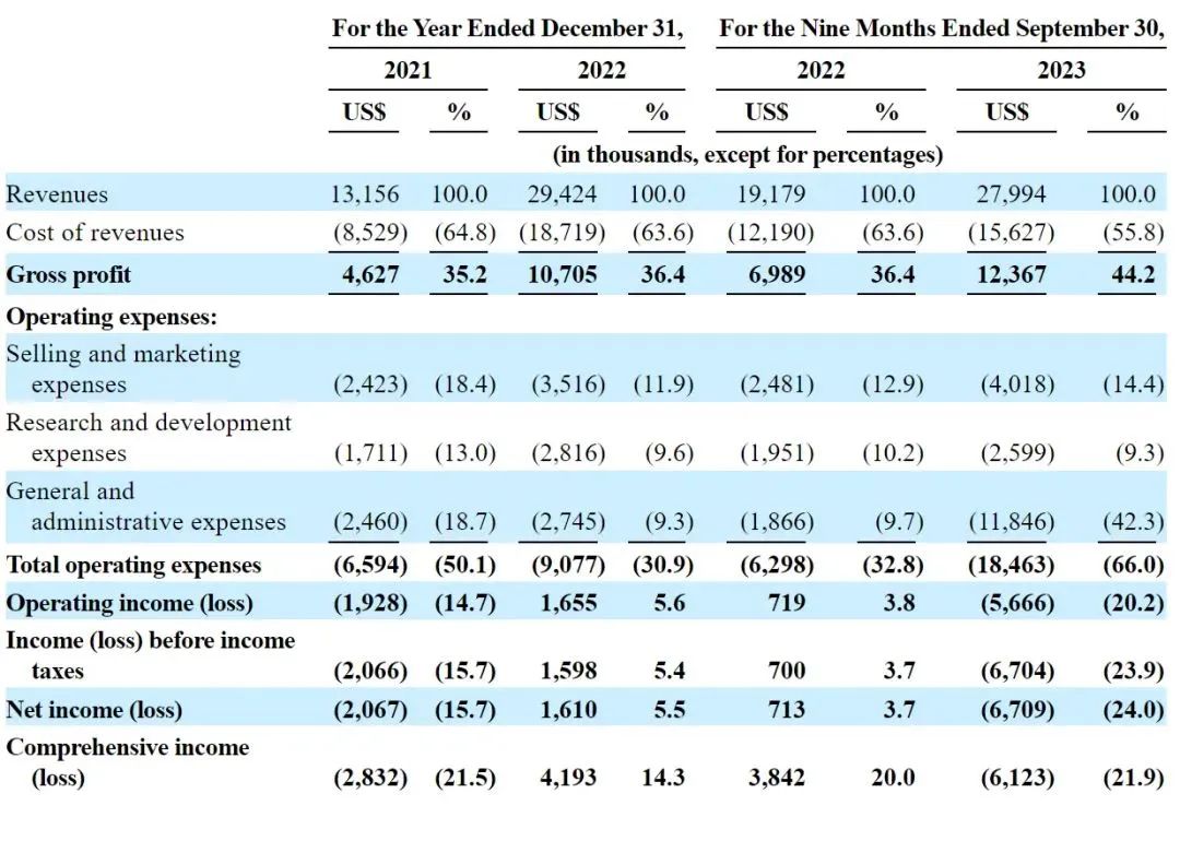 招股书显示,2021-2022年及2023年前9个月,XCharge的营收分别约为1315.6万、2942.4万、2799.4万美元;毛利分别约为462.7万、1070.5万、1236.7万美元;净利润分别约为-206.7万、161.0万、-670.9万美元。
