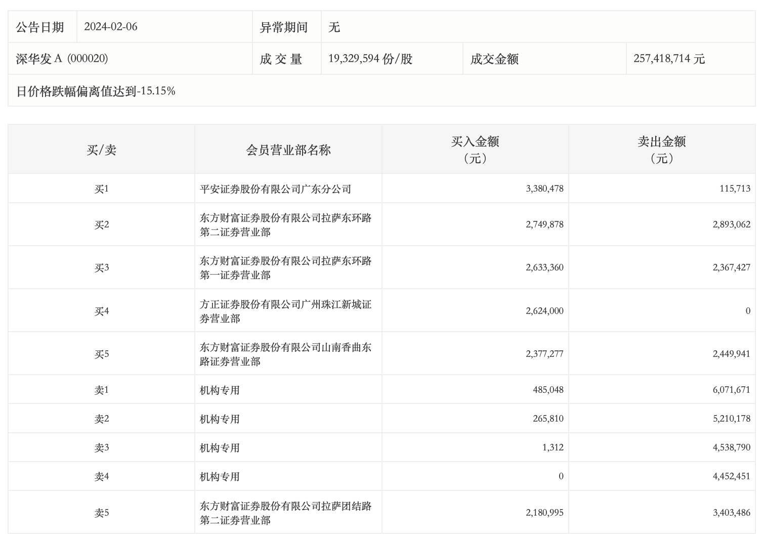 2月6日,深华发A今日跌停,全天换手率达10.67%,振幅达7.06%。龙虎榜数据显示,营业部席位合计净卖出1480.46万元。其中,机构买入75.22万元,卖出2027.31万元,合计净卖出1952.09万元。此外,东方财富证券拉萨团结路第二证券营业部、东方财富证券拉萨东环路第二证券营业部分别卖出340.35万元、289.31万元;平安证券广东分公司、东方财富证券拉萨东环路第二证券营业部分别买入338.05万元、274.99万元。