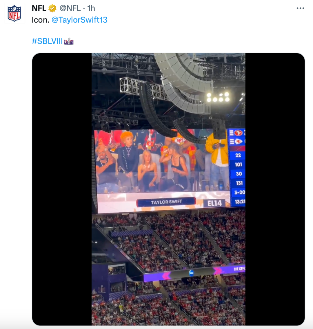 超级碗比赛期间,NFL官方社媒发布霉霉场边观赛视频并配文「Icon.」