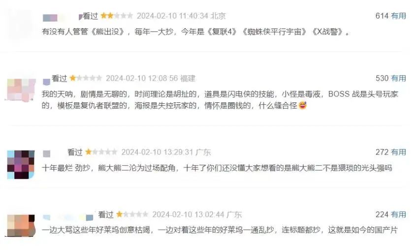 当然,与漫威等海外商业大片过于相似,也成为了目前影片差评中最核心的争议点。如何在包装上做出差异化和本土化,或许是《熊出没》下一步需要努力的方向之一。